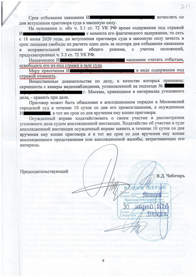 Заранее, на стадии следствия, адвокат принял меры к примирению с потерпевшей. Были принесены извинения, компенсирован моральный и материальный вред, достигнуто примирение. Также адвокатом были приняты необходимые меры для обеспечения участия потерпевшей в судебном заседании для донесения до суда позиции потерпевшей о том, что она просит назначить подсудимому минимальное наказание.