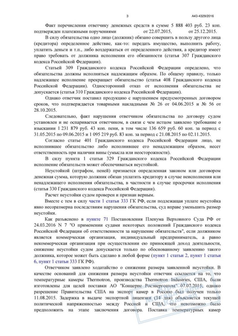 ООО "Т.Д. "П" взял на себя обязательства по поставке российскому энергетическому концерну оборудования на 5,9 млн. рублей. Однако обязательства свои не смог выполнить вовремя, из-за чего по договору должен был выплатить неустойку в размере 1 232 000 рублей.
