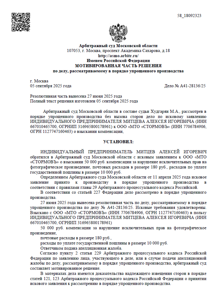 Нарушение было зафиксировано автоматизированной системой «Цифровое Око»: на сайте медицинской компании ООО «МТО «СТОРМОВЪ» в новостной статье использовалось фотографическое произведение «с башни Исеть 13». Мы собрали доказательства, подтвердили авторство фотографа Сергея Гарифуллина и направили иск в Арбитражный суд Московской области. Дело рассматривалось в порядке упрощённого производства.